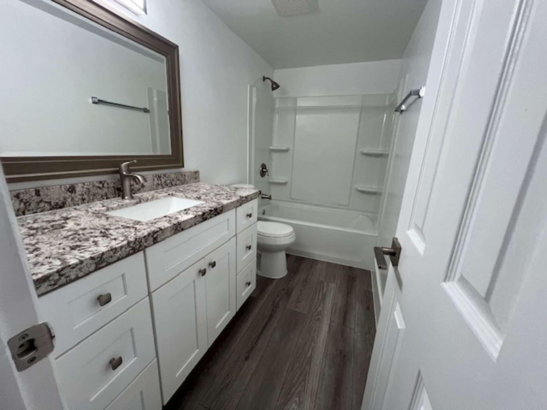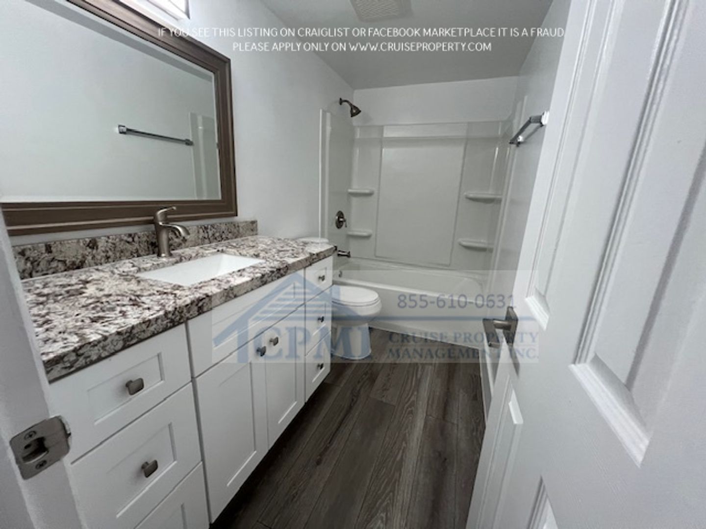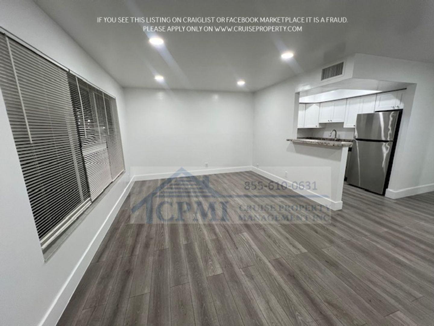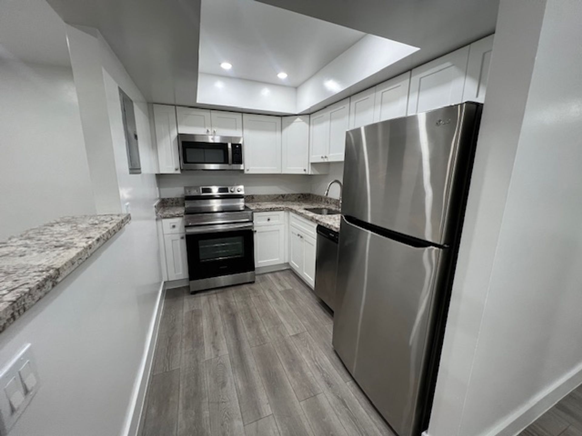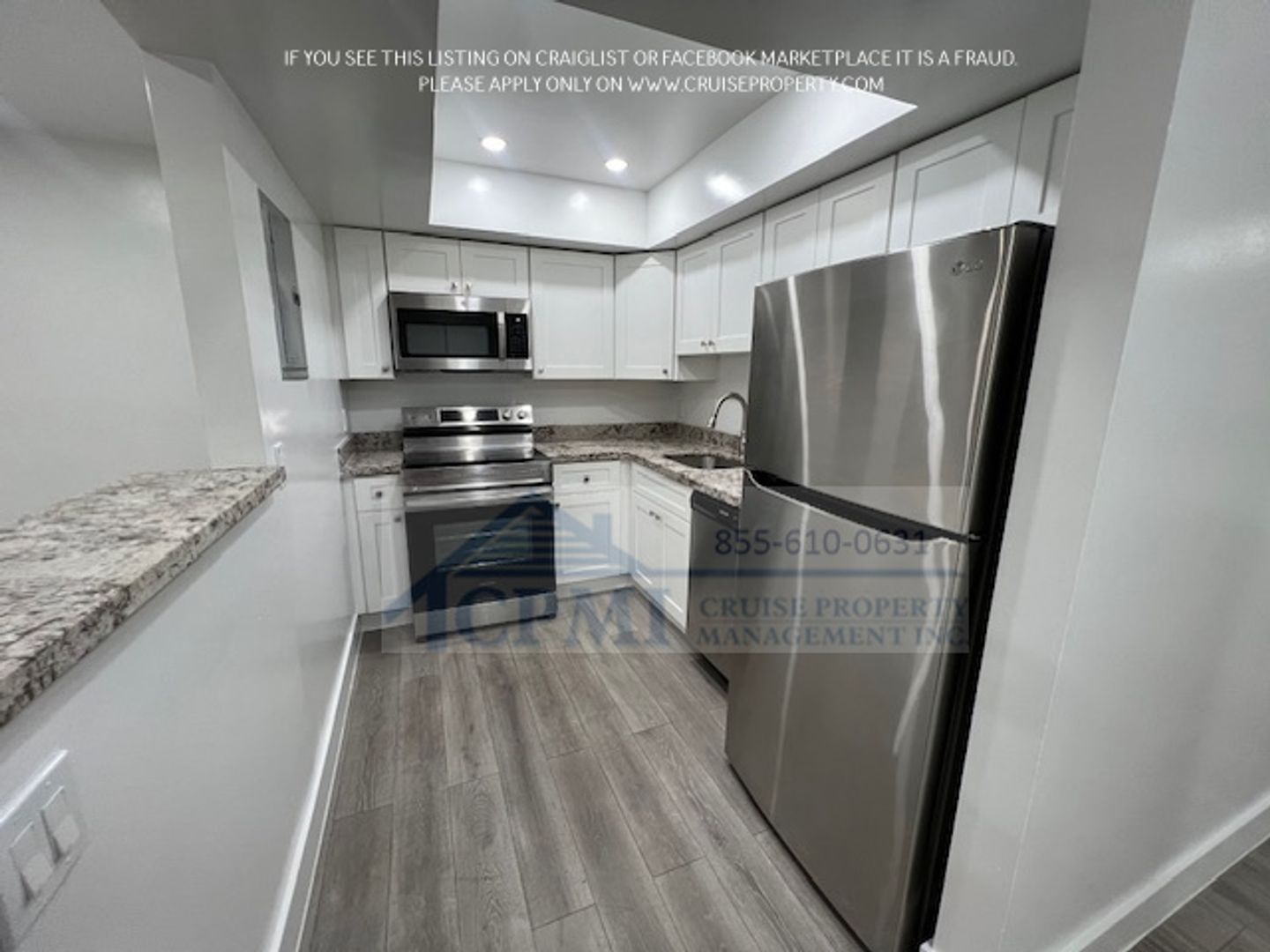 This rental property at 310 Lake Shore Dr, Lake Park, FL 33403 is a stunningly renovated 1-bedroom, 1-bathroom condo. It features impact windows and a gorgeous kitchen with elegant white cabinets and sleek granite countertops. The flooring throughout the unit is beautiful, durable laminate, adding a modern touch.